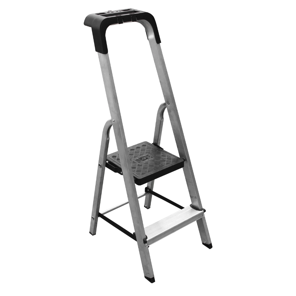 Possui estrutura reforçada, suporta até 150 kg e oferece mais conforto com degraus e plataforma mais largos.