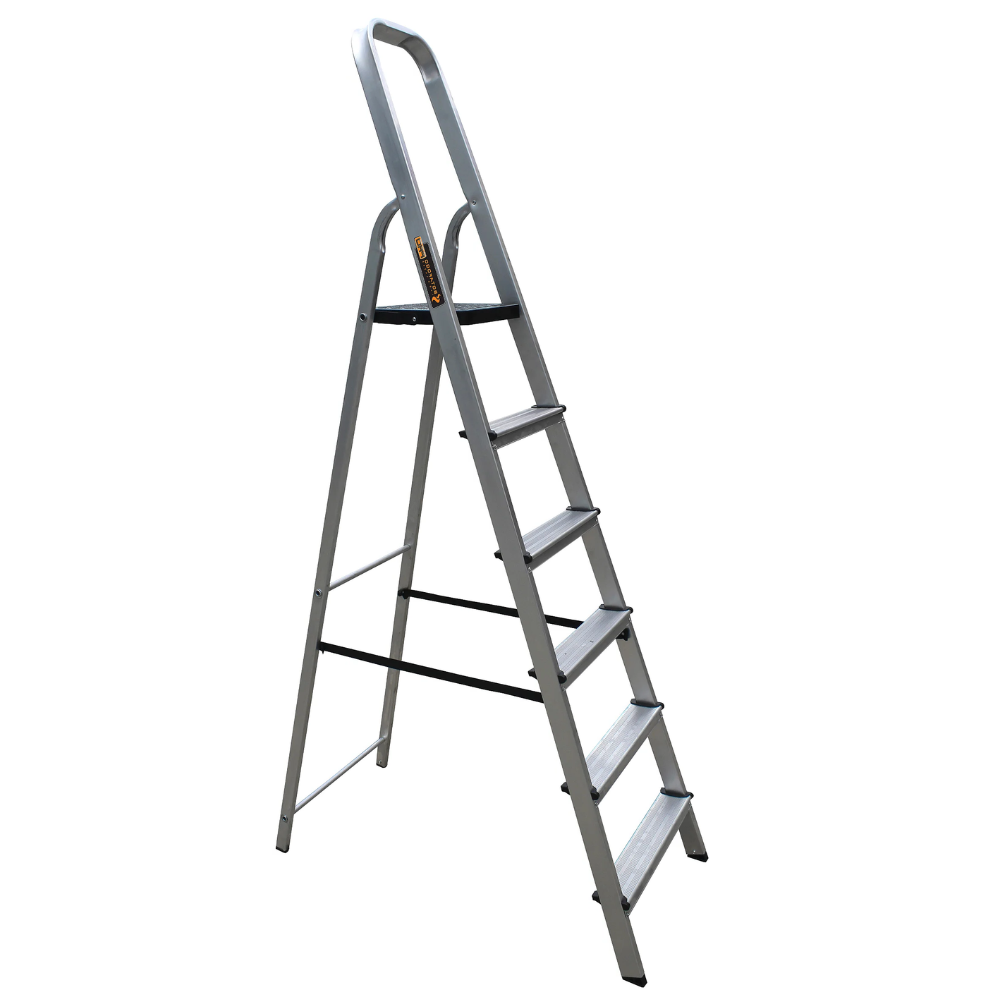 Possui estrutura reforçada, suporta até 150 kg e oferece mais conforto com degraus e plataforma mais largos.